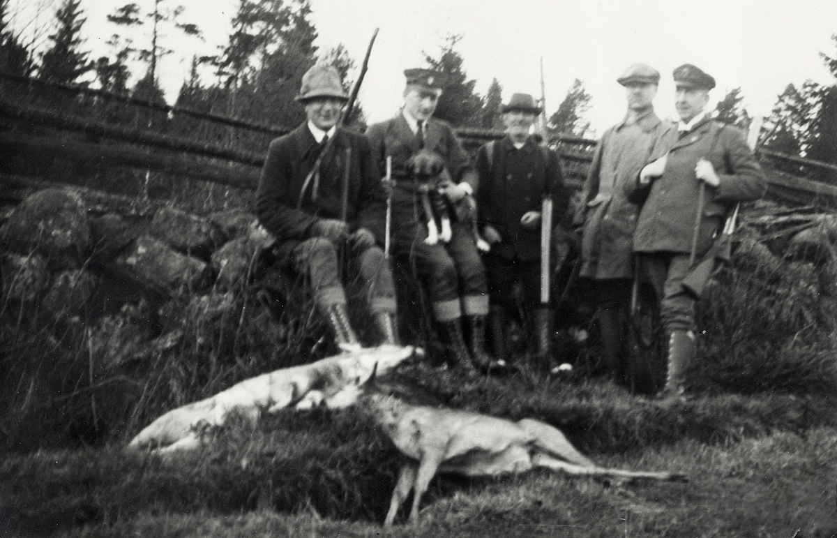 Ett jaktlag har samlats för gruppfoto efter rådjursjakten, ca. 1925.