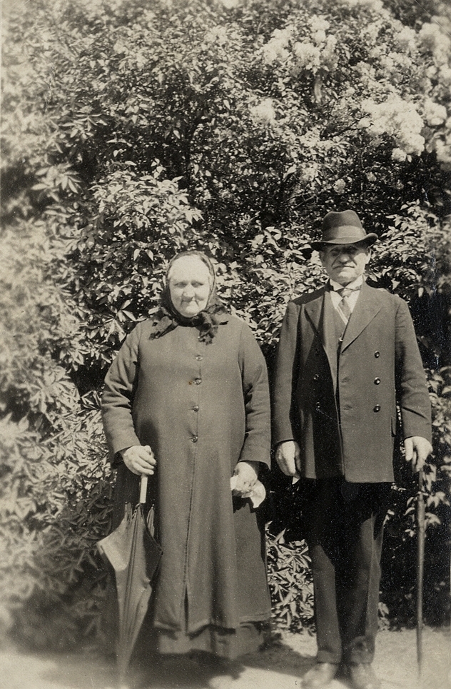 Ett äldre par i söndagskläder står framför ett buskage, 1925.