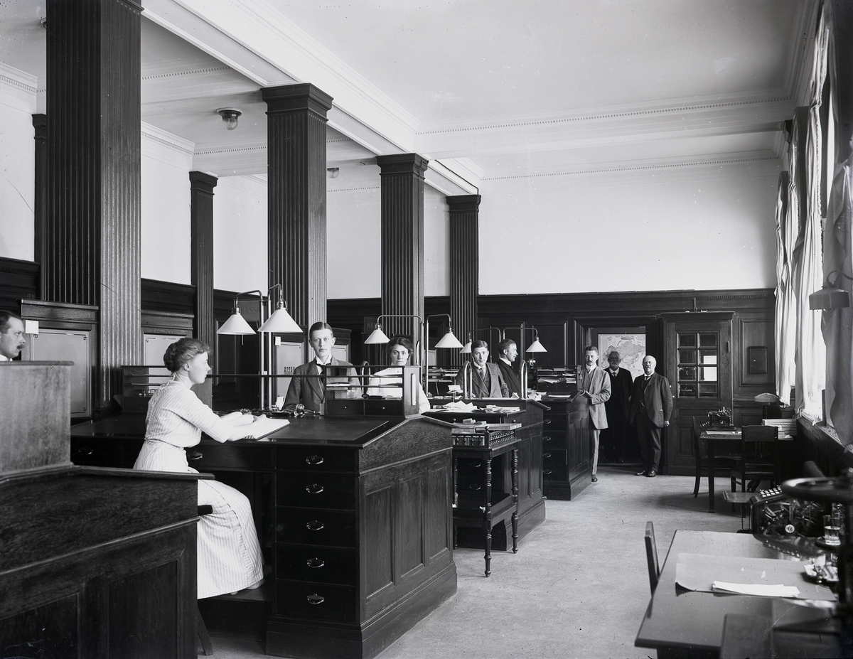 Sydsvenska Kredit AB, ca. 1910. Bankanställda, med kontorschef Hjalmar Petri i bakgrunden.
