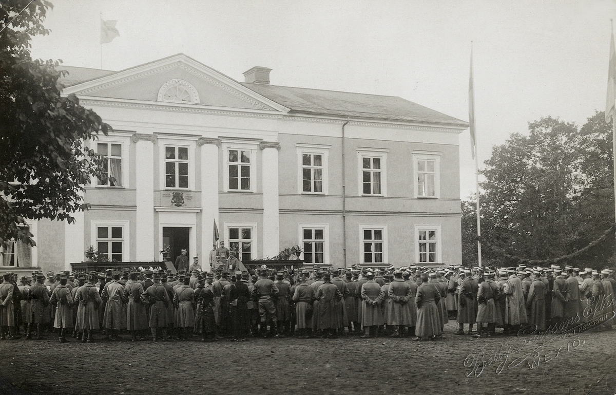 Genomgång av övningen, utanför huvudbyggnaden på Huseby. Militärerna är iförda blandade modeller av