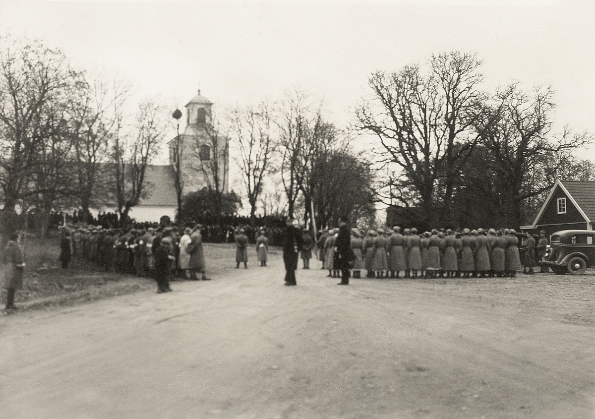 Samling av lottakår och musikkår m.fl. utanför Urshults kyrka, ca 1935.