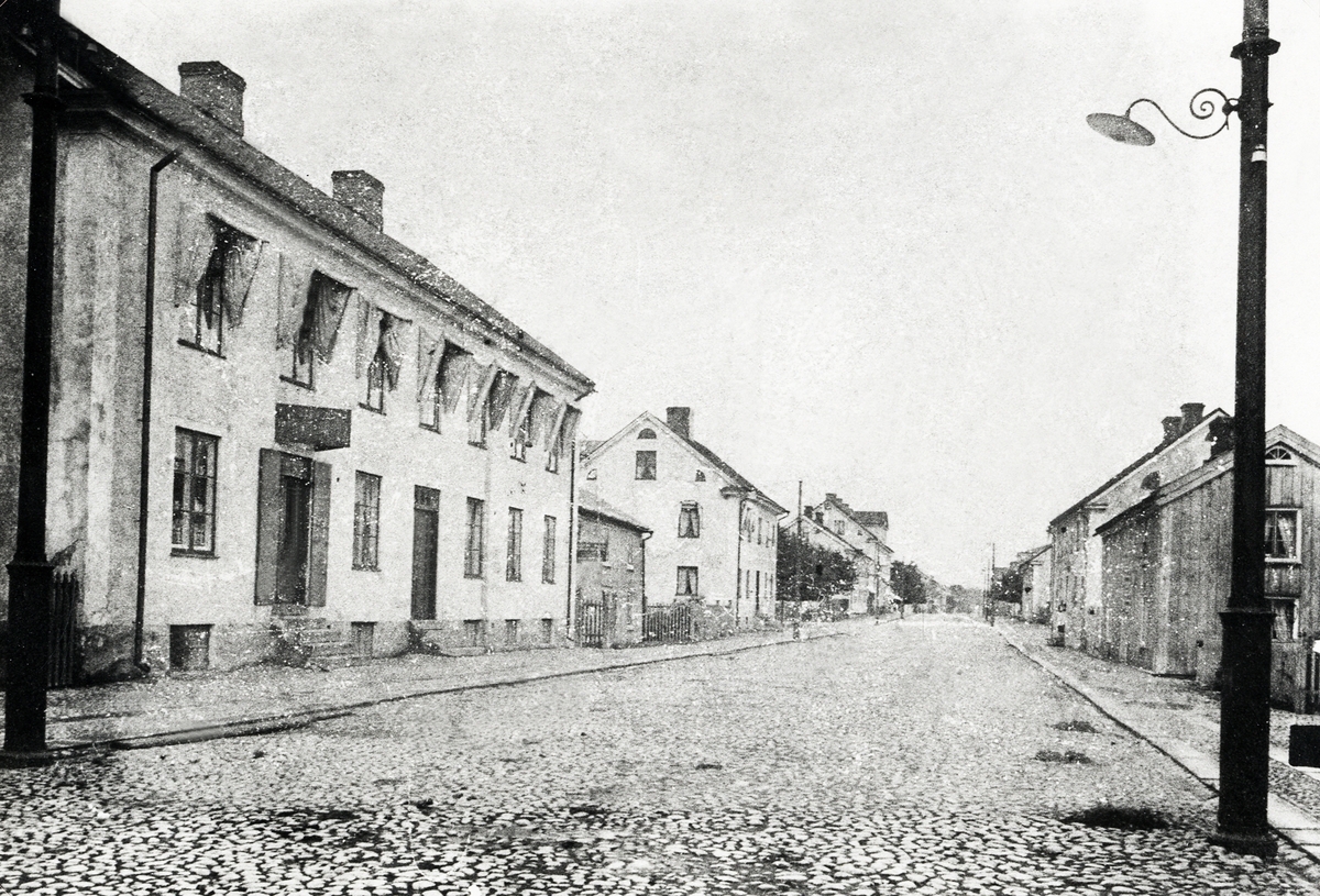 Storgatan, Växjö ca 1885, med blick österut. Till vänster (trol.) husen i kvarteret Tullen, följt av kvarteret Nunnan