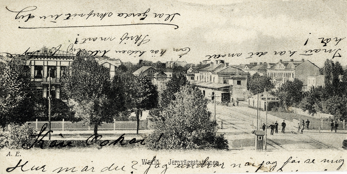 Dåv. järnvägsrestaurangen med stationsområdet, Växjö 1907.