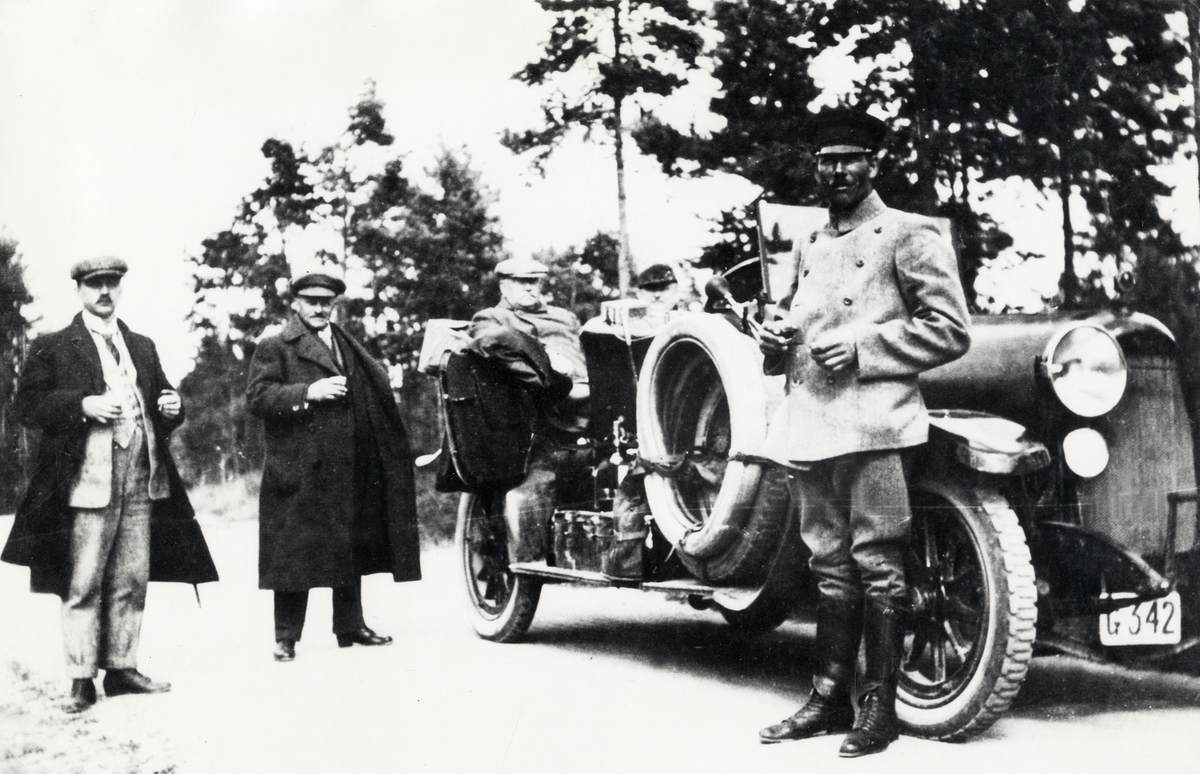 Personbil Horch, ca 1920. Tre okända män står bredvid bilen, inklusive en chaufför i uniform. I bilen sitter en fjärde man.