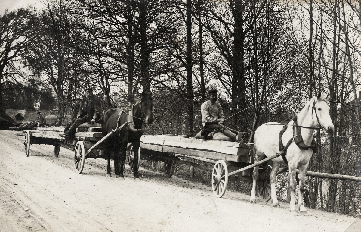 Timmerforor. Teleborg, Växjö, ca 1910. Karl Öhrn och Magni Svensson på var sin fora.