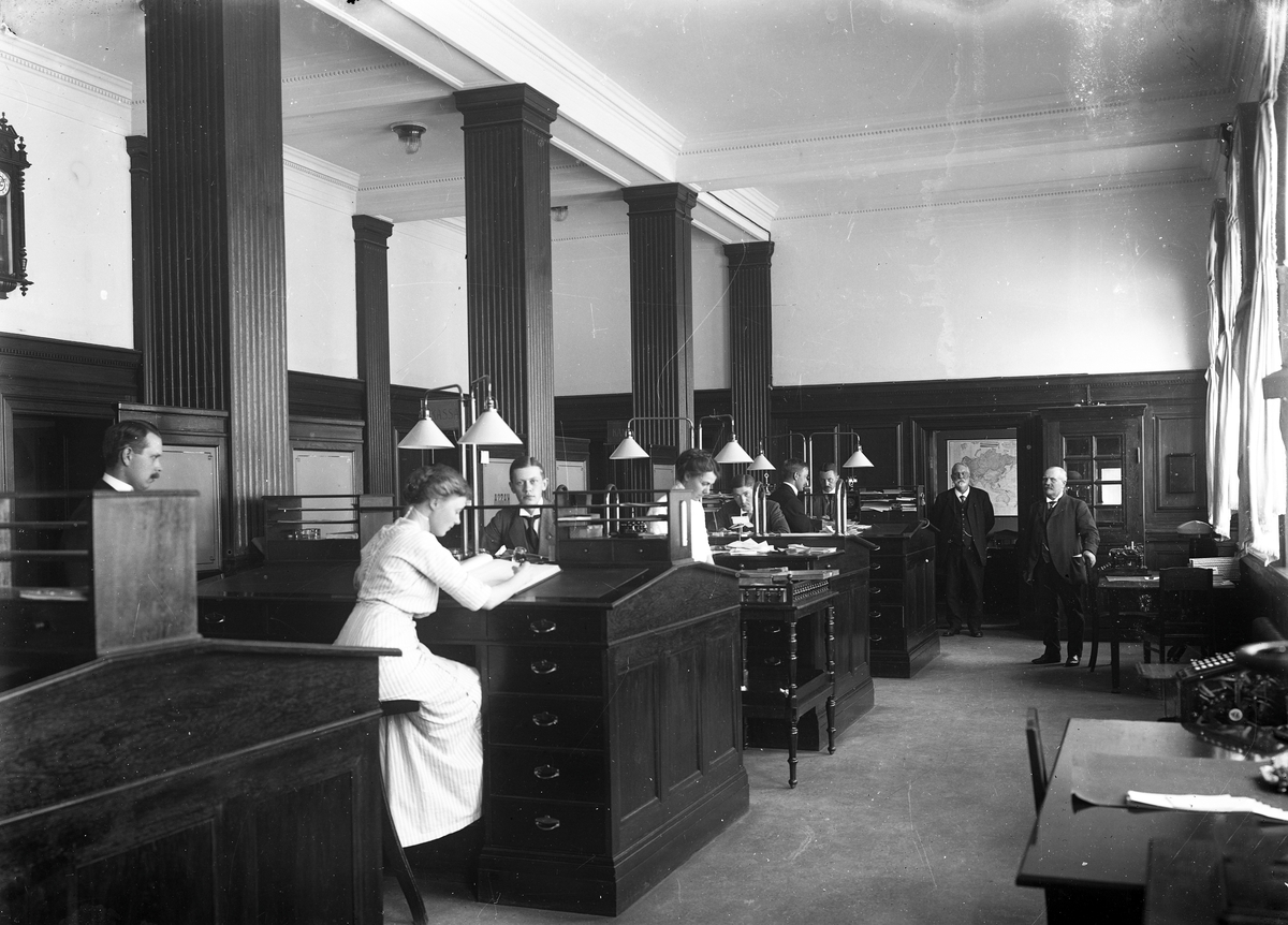 Sydsvenska Kredit AB, ca. 1910. Bankanställda, med kontorschef Hjalmar Petri i bakgrunden.