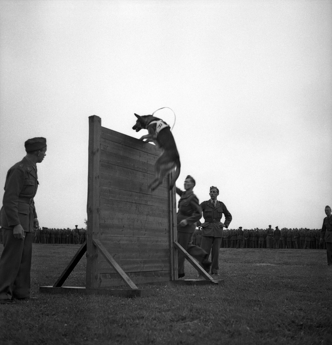 Försvarets dag. Foto av hunduppvisning med schäfrar på övningsfältet (i regnväder.)