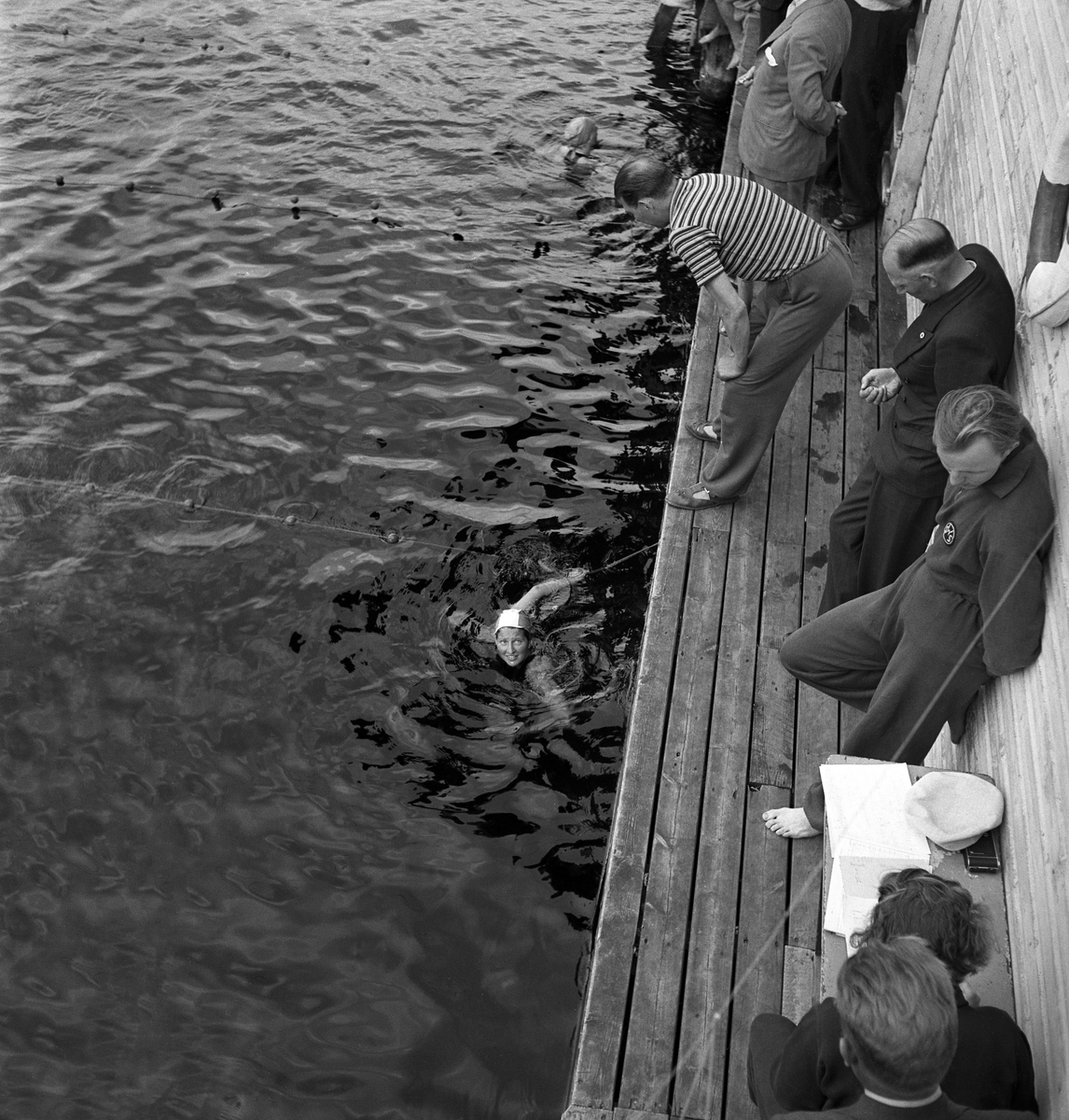Simningen. Vy över tävlingsbassängen. En kvinna har simmat in till bryggan vid badhuset och får några tips av tränaren.