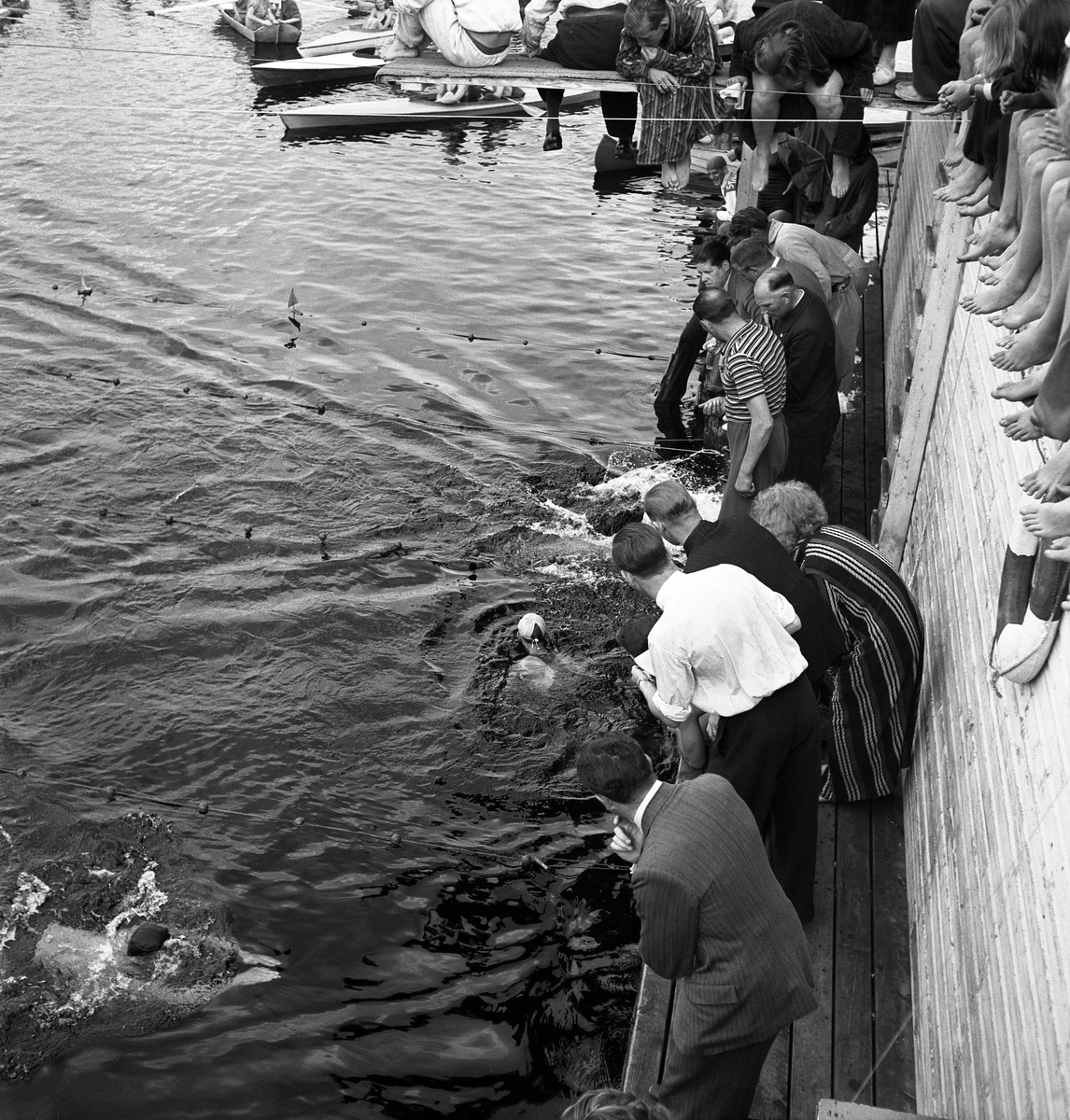 Simningen. Vy över tävlingsbassängen under tävling. Vändning vid bryggan utanför badhuset.
