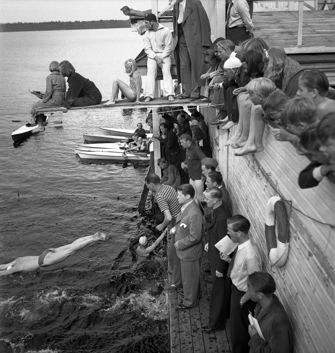 Simningen. Vy över tävlingsbassängen m.m. under tävling. Stafettlopp (?).