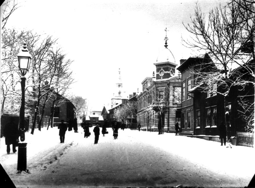 Huset t.v. revs innan fastigheten Storgatan 30 bebyggdes 1901-02. T.v. vid främre lyktan var droskstation med foderkrubbor. Där brukade Gull-stubb och Kalle Kusk hålla till. T.h. apoteket före ombyggnad samt bankhuset (Forsska huset) och Jouvins hotell.