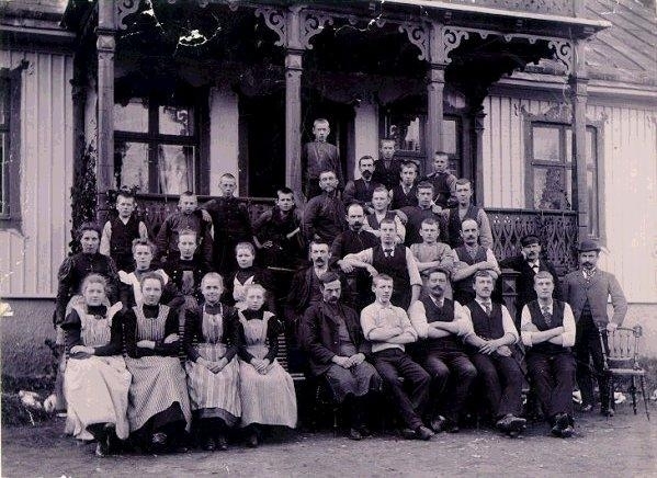 Kv. Steglitsen, Eriksbergsgatan 7, Allégatan 12. Eriksbergs skofabrik 1897. (Nämnes även Mössebergs skofabrik) Från vänster: nr 1. Ljungkvist . Nr 2. Eriksson 3. Erik Andersson 4. Fridolf Berg 5. Ax. Blom 6. Olsson 7. Kvist 8. Alb. Fahlgren 9. Moberg 10. F. Sandgren 11. Andersson 12. Thylén 13. Blom 14. K. Friberg 15. Härdenberg (fabrikör) 16. Kumte (verkmästare) 17. Kämpe 18. Bergkvist 19. Arvidsson 20. Ax. Berg 21. Ellen Setterberg 22. Julia Setterberg 23. Ada Bergendahl 24. Viktoria Olsson 25. Andersson 26. Viktoria Andersson ? 27. Ragnar Johansson (Brodd) 29. Karl Mecher 24.