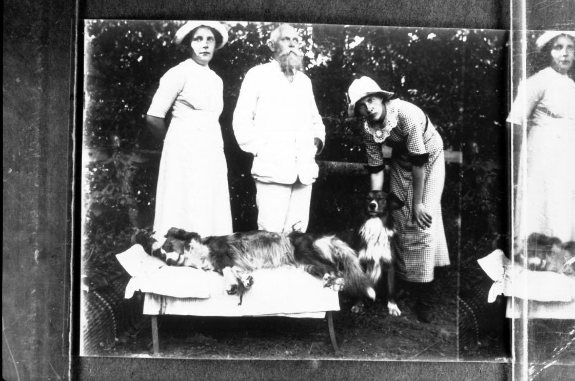 Gullåkra. Edla Wikman, Erik Stenholm, Elma och hunden Gral. (På bänken ligger hunden Semiramiss som är död, blev dödad av en luffare.)