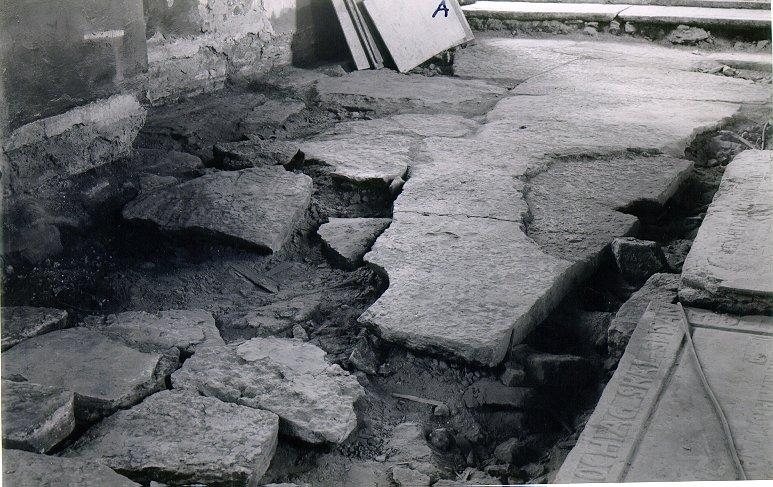 S:t Olofs kyrka. Restaureringen 1958-1961. Långhuset. Mellanpartiet av det äldre flisgolvet under södra bänkkvarteret (efter borttagande av lös sten) sett från nordost. A-B är södra gångens båda gravhällar i sitt gamla läge.