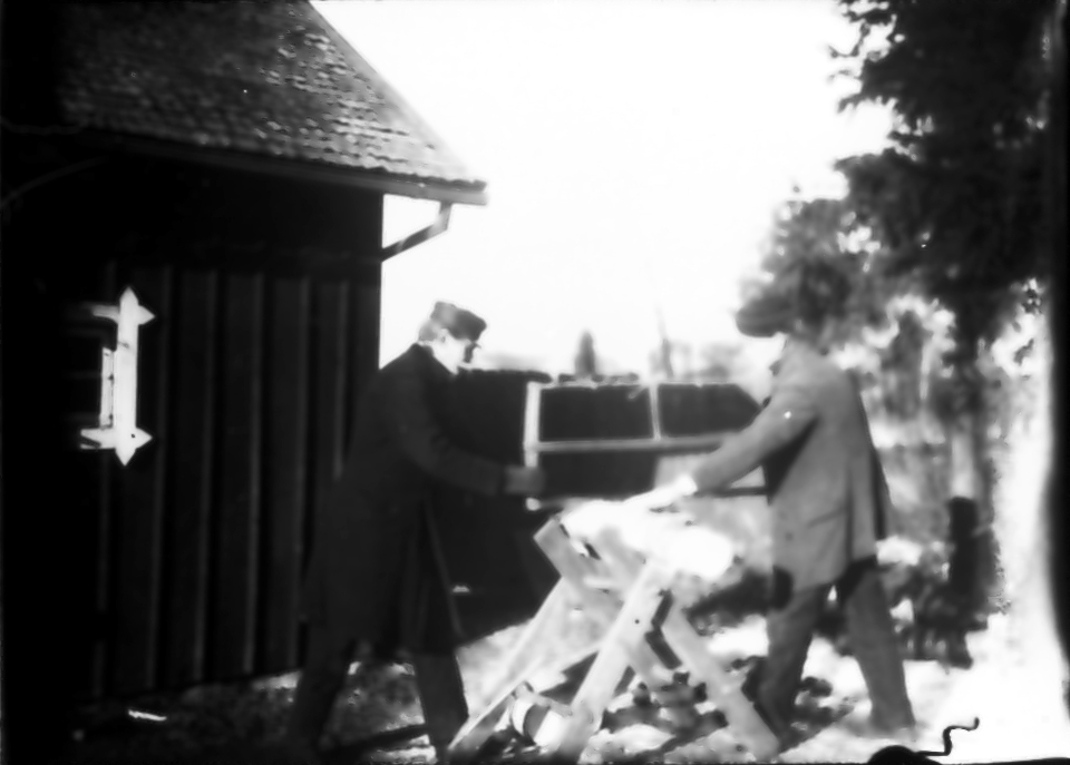 Vedsågning hos Holmströms, Flobys äldsta hus i början av Gullåkravägen. T.v. skräddaren Anders Johan H.