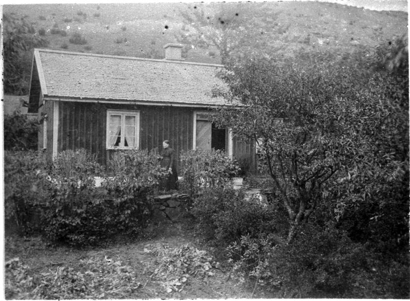 Bestorp, Gläntan. Britta Persson utanför sin stuga i Bestorp. När Doktor Axel Wersén slutade sin anställning som överläkare vid Mössebergs badanstalt och Sanatorium och öppnade praktik i Stockholm, köpte han denna stuga. Stugan kallas Gläntan och är den enda i original som finns kvar. Ursprungligen bebodd av soldaten Sköld.