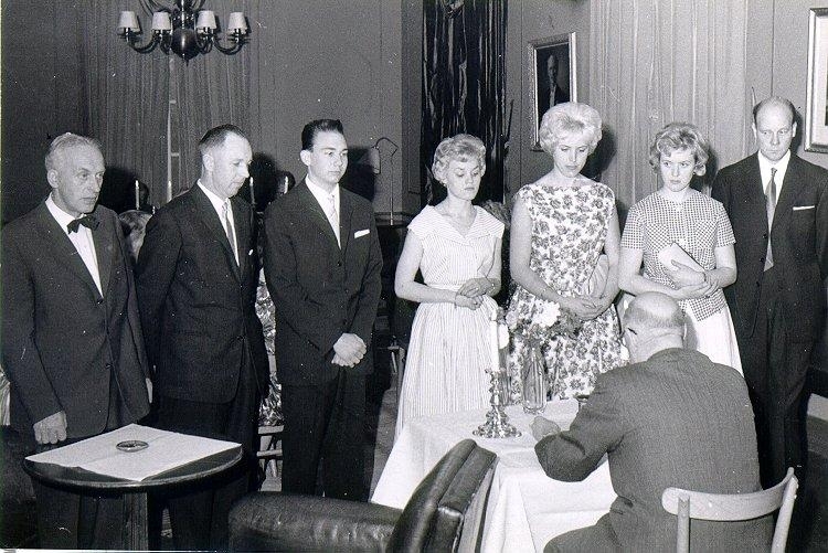 Falköpings Hantverks- och Industriförening. Högtidligt gille 1960. Ålderman Gust. Johansson, ungbröder: Fredy Jonsson och Olle Hellman. Gesäller: Sven Klingberg (snickare?). 3:e från vänster Rolf Westberg, frisör.