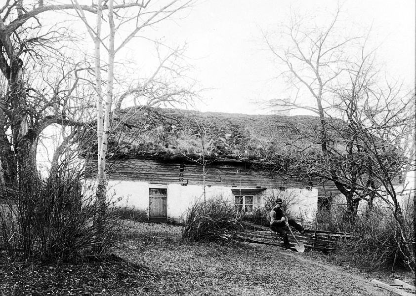 Borgatorp. En egendomlig byggnad med metertjocka murar. Ingen torde veta till vad ändamål huset ursprungligen uppförts. Överbyggnaden har tillkommit på senare tid. Mannen på bilden Johan Efraim Olofsson (1859-1932).