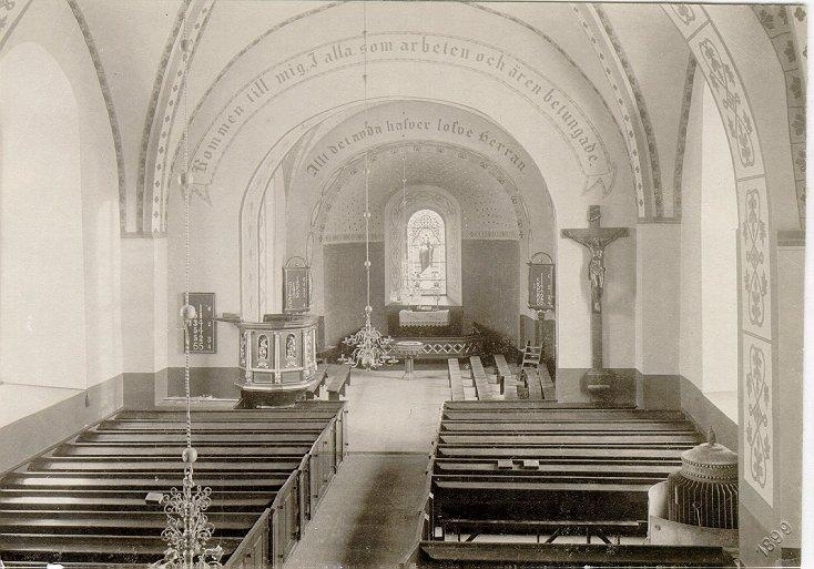 S:t Olofs kyrka. Interiör av Falköpings kyrka. Före Filip Månssons restaurering 1899 innan centralvärme infördes. Predikstolen flyttades då åt höger och kristuskorset flyttades åt höger över lekmannaaltaret.