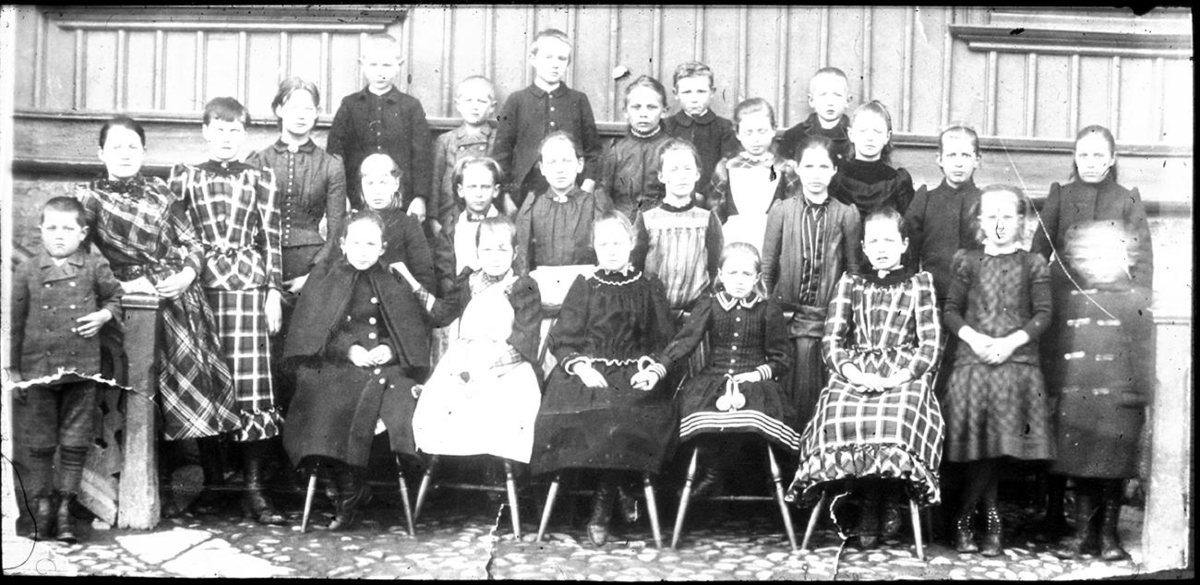 Skolklass, Köllerströms skola, Storgatan 2. Övre raden från vänster : 1. Erik Janzon, 3. Gunnar Wiik, 5. Gerhard Kappers, 7. Valdemar Janzon. Mellanraden: 6. Hildur Pettersson, dotter till Läroverksadjunkt Pettersson. Flickor, från höger, mellanraden : 4. Valborg Sundberg, 6. Ingrid Sundberg, två flickor i rutiga klänningar: t.h. Elna Helander, t.v. Tullie Helander g. Koch. Nedre raden : 1. Gustaf Janzon, 3. dotter till polis Högberg, 4. Hilma Ericson.
