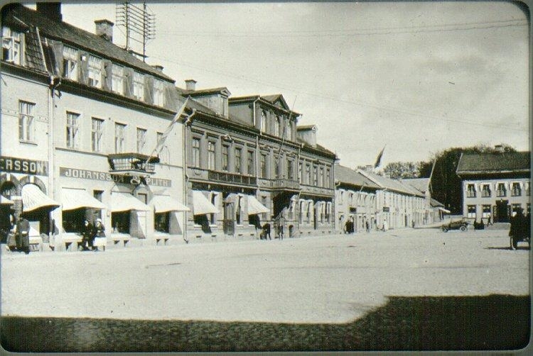 Stora torget med Svante Lundbergs hus i fonden. Senare vanligen kallat spritbolagets hus eller helt kort Bolaget. Då avdelningen mot Storgatan hade ölutskänkning benämdes denna oftast "Tuppens". År 1941 övertog Wera-Magasinet denna del, varför den i fortsättningen fick heta "Wera". Det var i denna del som branden i december 1963 började. Hela komplexet brann ned till grunden.
