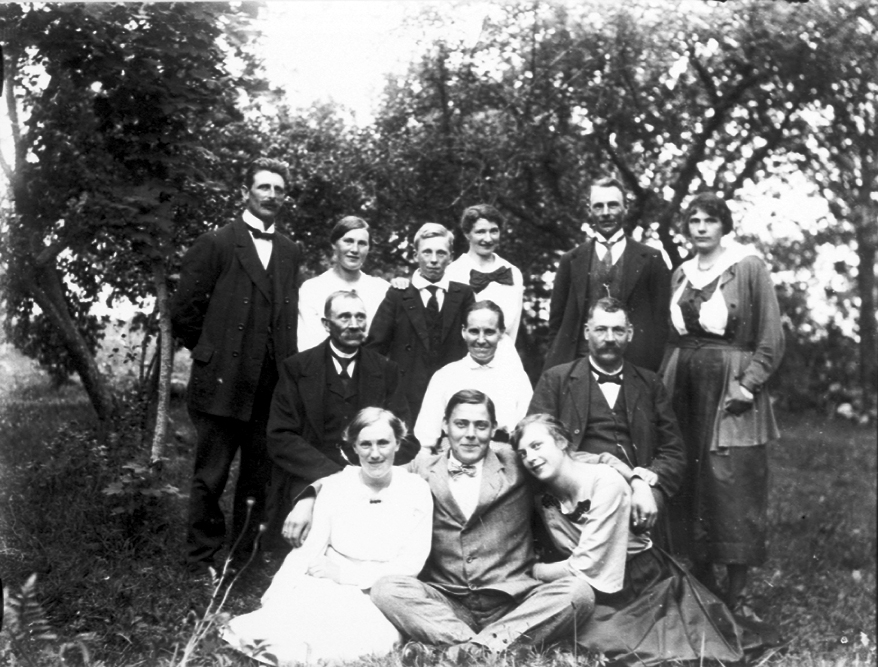 Lillagården. Stående Georg Vilander Augustsson, Ellen Gustavson, Erik i Lillag., okänd, Hervid Andersson. Mellanraden Alfred och Matilda och Alfred Gustavsson, Främst Hildur G och två okända.