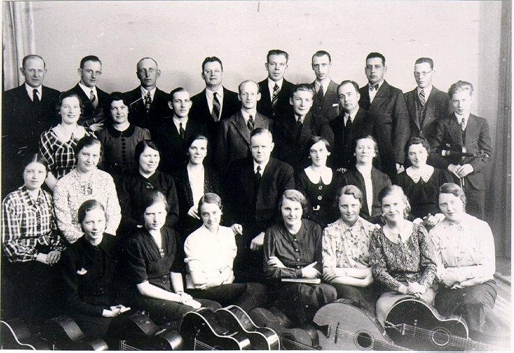 Pingstkyrkans strängmusikkår 1938. Bakre raden: Josef Larsson, Stig Svensson, Ivar Andersson, Nils Johansson, Petrus Lidén, Erland Westergren, Ragnar Sabel, Lars Lindberg och Anders Otterland. Tredje raden: Karin Svensson, Linnea Johansson, Erik Ivarsson, Nils Rask, Arne Karlsson och Martin Gustafsson. Andra raden: Astrid Klasson, Signe Klasson, Gertrud Dahlström, Magda Wahl, (ledare för strängmusikkåren), Josef Karlsson pastor, Hildur Sabel, Anna Björk och Maj Adolfsson. Främre raden: Lisa Karlsson, Dagmar Persson, Signe Sunnergren, okänd, Britta Fransson och Doris Otterland (syster till Anders Otterland). Foto tillhör Hildur Sabel.