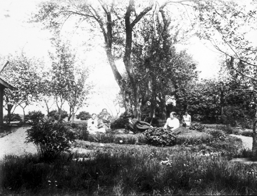 I Bonnagårdens trädgård på baksidan av huset. Sommarflickan Astrid, Ellen, Torsten, okänd och Jenny Andersson.