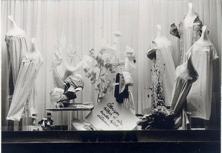 Titel: Trätorget. Veramagasinet öppnade sin affär i barack å Trätorget april 1964 efter branden vid Stora torget 1963. Baracken var kvar i fyra år, då Veramagasinet flyttade till S:t Olofsgatan 3.