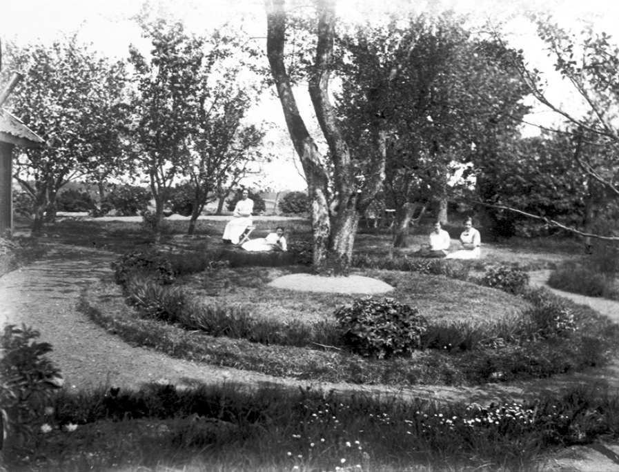 I Bonnagårdens trädgård på baksidan av huset. Den gamla stugan t.v. i bilden. Ellen Andersson, sommarflickan Astrid från Göteborg, okänd, Jenny Andersson.