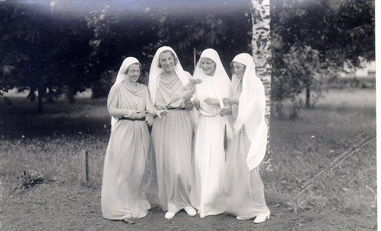 Kulturhistoriska festtåget och Festspelet i Falköping den 5 augusti 1934. Historiens gudinna, skrivande å hävdens blad. Hon åtföljes av de tre nornorna, Urd, Verdandi och Skuld, vilka å slända spinner på ödets trådar. Fantasidräkter.