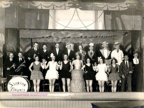 Singing Players Teatersällskap. Nyårsrevyn Leve. Placering överst fr.v. 1. Gösta Alexandersson, 2. Lasse Hallden, 3. Gustav Forsell, 4. Nisse Granberg, 5. Maja Jakobsson, 6. Halvdan Andersson, 7. Erik Kjellman, 8. Gösta Fransson, 9. Harald Blomén, 10. Johannes Andersson, 11. Doris Hjalmar, 12. Astrid Johfur, 13. Gunborg Adamsson, 14. Annie Brissman, 15. Erna Ström, 16. Asta Selander, 17. Doris Granberg, 18. Sven Svensson, 19. Arne Brissman.