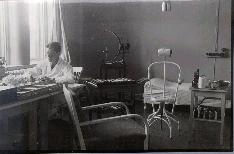 Ögonläkare Doktor H. Key i sitt mottagningsrum på lasarettet.
