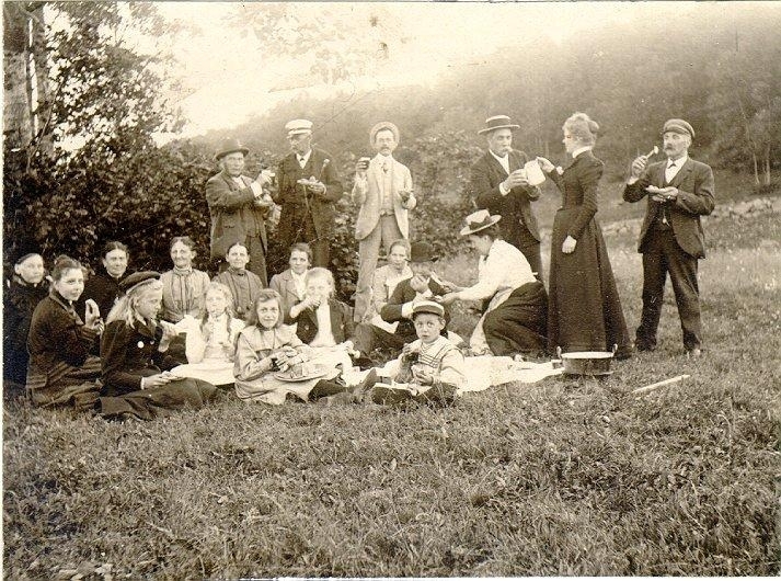 Logen Falbygden på utflykt till Mösseberg. Janne Hall får kaffe. Fru Andrésen sitter vid hans fötter. Fru Modin nr 2. "Man kan ha det angenämt en vacker sensommardag i gröngräset på sluttningen av Mösseberg".