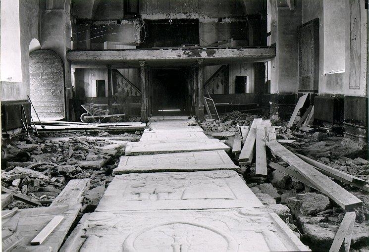 S:t Olofs kyrka. Restaureringen 1958-1961. Långhuset. Foto mot orgelläktaren sedan golvet uppbrutits. Bakom orgeln fanns en hög brädpanel.