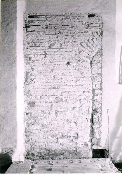 S:t Olofs kyrka. Restaureringen 1958-1961. Långhuset. N.väggen. Del av den igenmurade norra, romanska portalen.