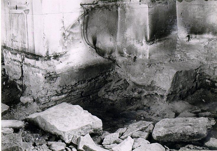 S:t Olofs kyrka. Restaureringen 1958-1961. Långhuset. Sydöstra hörnet, ev. med rester av ett sidoaltare. Foto från nordväst.