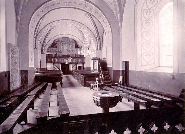 S:t Olofs kyrka. Äldre interiör mot läktaren.