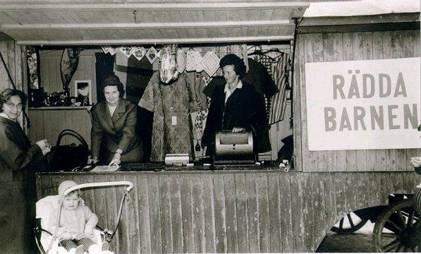 Från Rädda Barnens försäljning på Stora torget 1963. Vagnen är lånad av Lottakåren i Falköping. Rädda Barnen: Ruth Blom, född Eriksson, ordförande i Rädda Barnen, Anna Lisa Johansson, född Johnsson (i mitten), Rut Rudberg, född Svensson (längst till höger), Eva-Marie Mohlin (i barnvagnen).