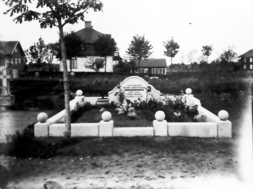 Grav för Frans Andersson och Frida Maria Andersdotter. I bakgrunden kyrkskolan och lärarbostaden. Till höger den gamla fattigstugan som revs 1939.