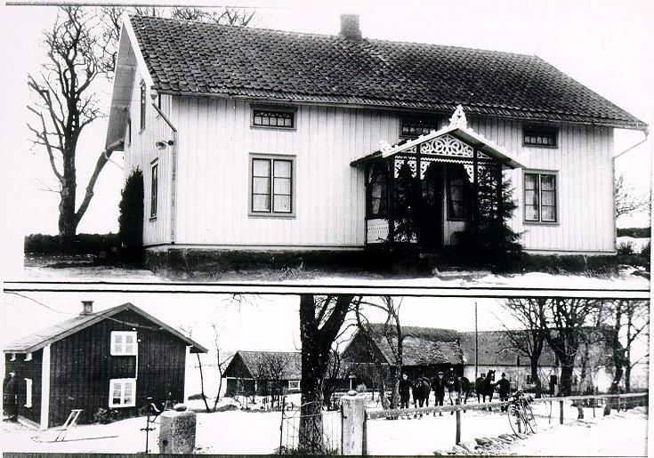 Storegården, Öja, Vartofta-Åsaka socken."All Världens Karlssons" cykel vid staketet. Personer från vänster: Bröderna Henry, Paul och Gunnar Arvidsson.