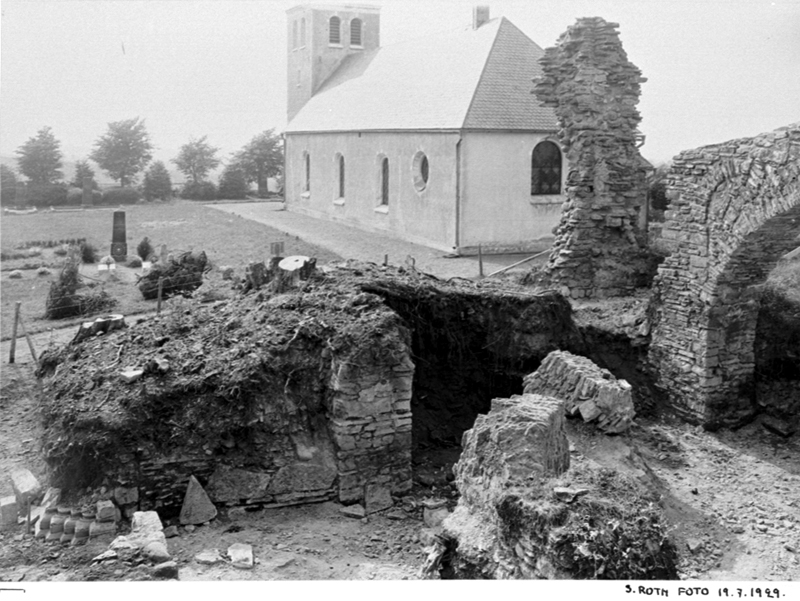 Södra delen av klosterkyrkans västparti under utgrävning. Sydportalens västra bas. Tympanonstenen nr. 285 i läge som den påträffades. I bakgrunden syns Gudhems kyrka.