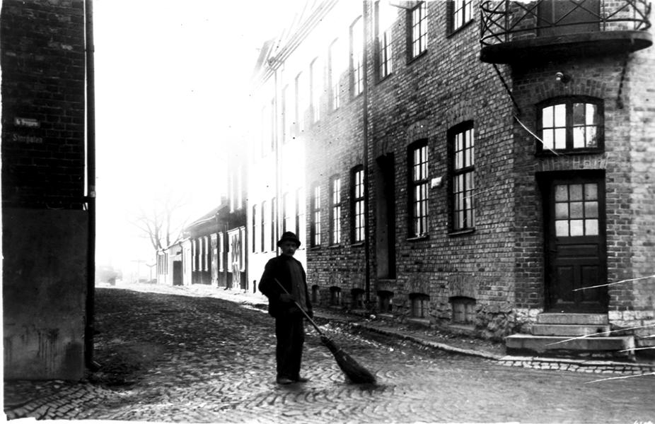 Gatsopare på den gamla utfartsvägen till Göteborg som går i skarp vinkel från Storgatan mellan bryggeriet Viktoria och fabrikskomplexet Västra Sverige.