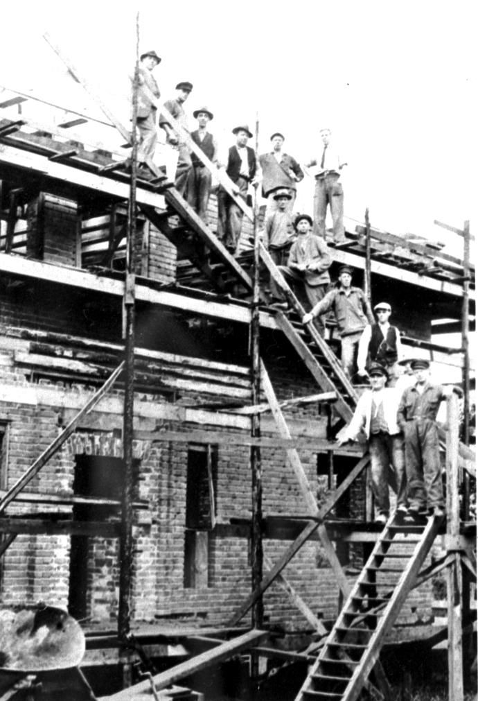 Titel: Ögonläkare dr. Keys bostadsfastighet 1937. Byggm. Karl Gustavsson Falköping (inringad å nedre bilden). Framsidan av huset. Överst på bilden från vänster: K. Gustafsson , byggmästare. G. Hjerp, snickare E. Eriksson, snickare A. Andersson, snickare. Nedanför å trapplandgången O. Lundgren, grov. Aronsson, elektriker, Andersson, grov. S. Björnberg, grov. Olsson, murare (skymd) Jansson, murare, J. Crona, snickare. Baksidan av huset. Personer från vänster på bilden: Olsson? murare, S.Johansson, grov, S. Björnberg, grov,.Jansson, murare, H. Johansson, elekt. O. Lundberg, grov. Aronsson, elekt. Andersson, grov. G.Hjerp. snick. E. Eriksson, snick. K. Gustafsson, byggmästare. Överst: A. Andersson, snickare. Samtliga namnuppgifter efter anteckningar på baksidan av kortet.