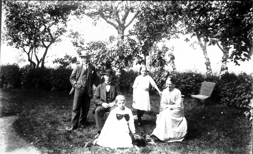 I trädgården till Degs på Heden. Sonen Johan, Alfred Dag, dottern Sigrid, en ferieflicka, hustrun Selma.