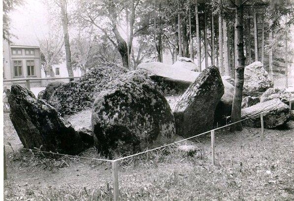 Planteringsförbundets park. Gånggriften Kyrkerör strax före restaureringsarbetets början 1928. Graven sedd från nordost - kammarens norra del med nedfallet takblock av kalksten samt kullvräkta sidohällar.