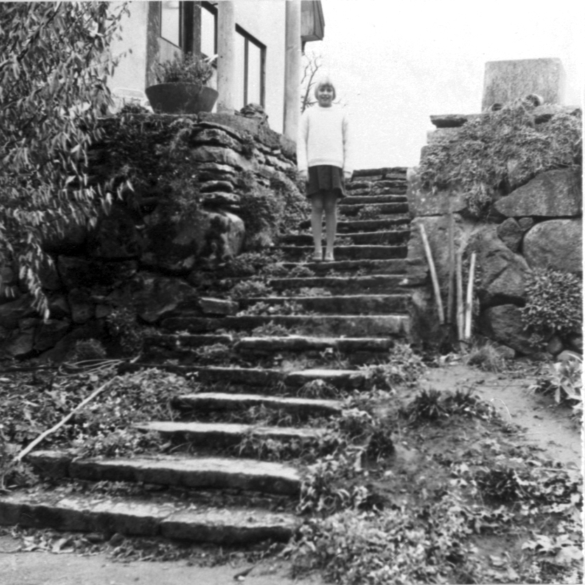 Västra bostadsflygeln. Södra gaveln med trappan från trädgården upp till gårdsplanen.