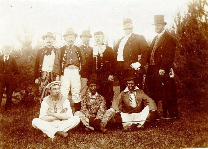 Från en fest i Planteringsförbundets park för dess kassa. Agerande: Stående från vänster: Urmakare N.A. Larsson, handlare Gustaf Andersson (Stekis), godsägare Leopold Warodell, Wilhelmsro, tandläkare Axel G. Rane, länsman Stig Helander, stationsek. Carl Lagergrén. Sittande från vänster: grosshandlare Mårten Haglund, köpman Anders Mörkoch manufakturhandlare Erik Kilander.