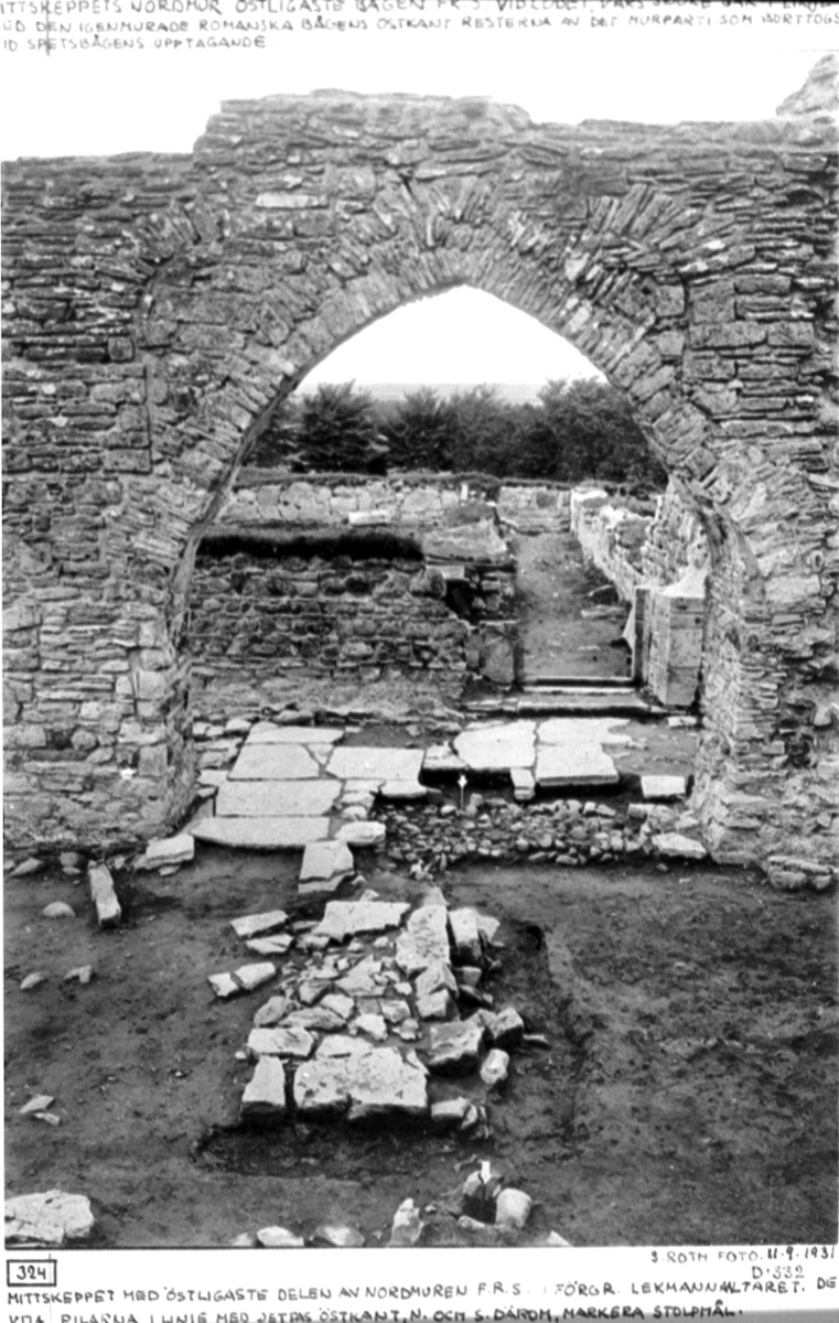 Mittskeppet med östligaste delen av nordmuren från söder. I förgrunden lekmannaaltaret. De vita pilarna i linje med dettas östkant, norr och söder därom, markerar stolphål.