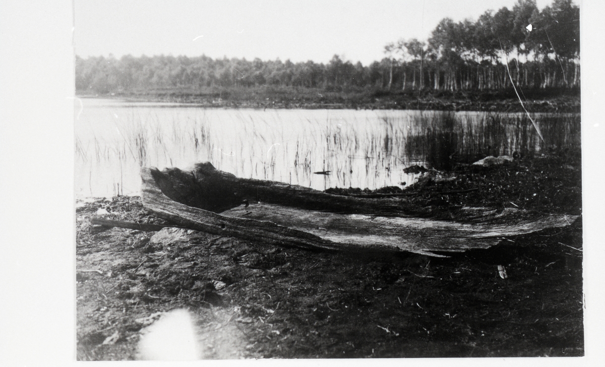 Rösjön. Ur vattnet uppdragen "ekstock", urholkad båt av ek vid Rösjöns strand.